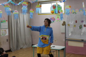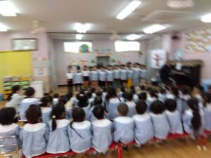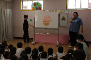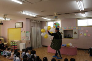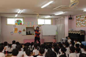先生たちからの出し物もありますよ。手品を見たり、寸劇やヒーローショーだったりと毎月変わるいろんな出し物をみんなとっても楽しみにしています。